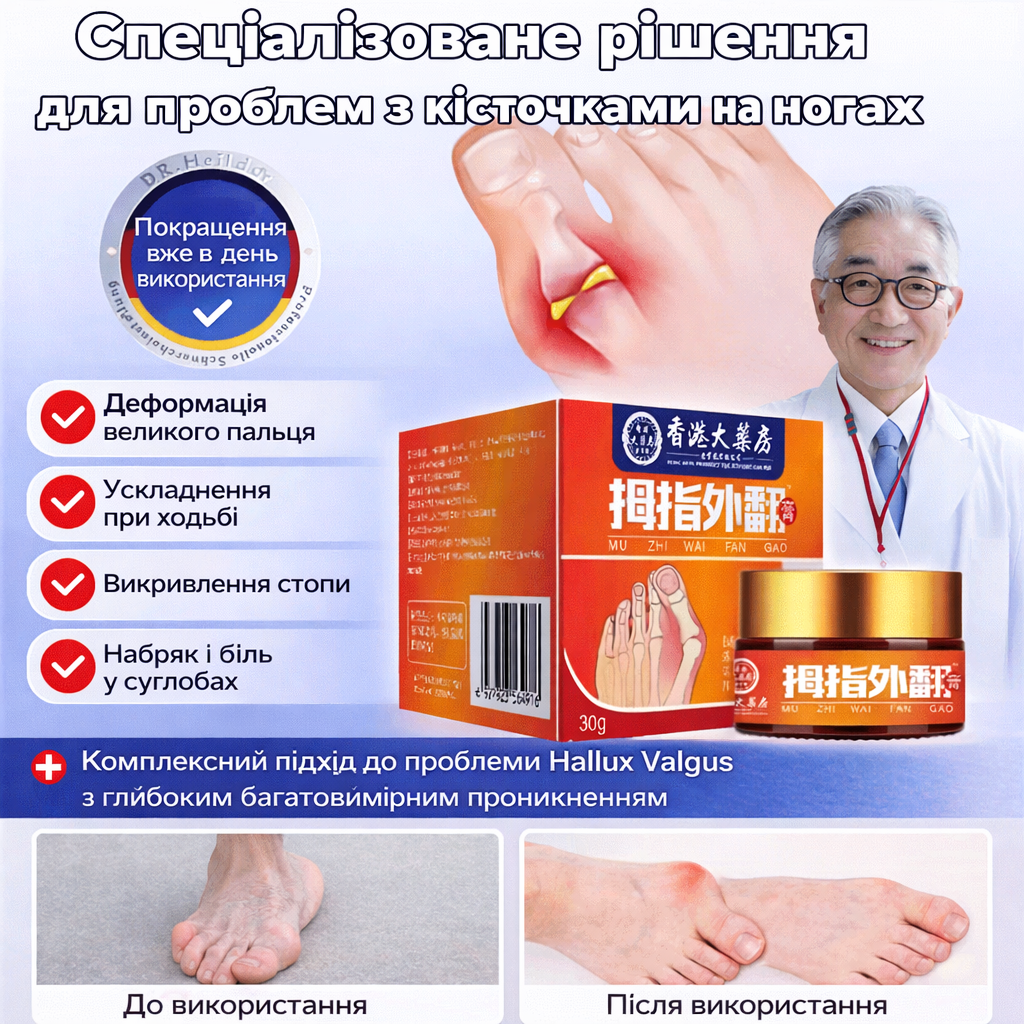 Крем для щоденного догляду за зоною «кісточки» (вальгусної деформації) біля великого пальця. Допомагає зменшити дискомфорт від тиску взуття, сухість та стягнутість шкіри, робить ходьбу приємнішою та легшою. Формат 30 г — зручно брати з собою.